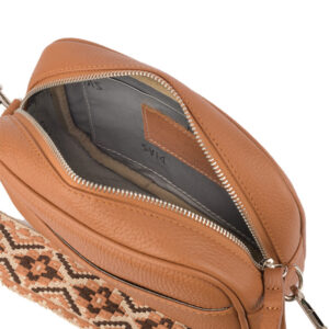 A leather crossbody bag for women with a decorative fabric strap. It is handmade and worn from morning to night! The design itself is very good in sales because it is the absolute size that fits the essentials. Features one interior flat pocket, one interior small open pocket and top zip closure. CHARACTERISTICS Material Cow…