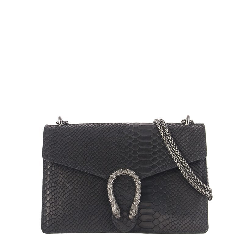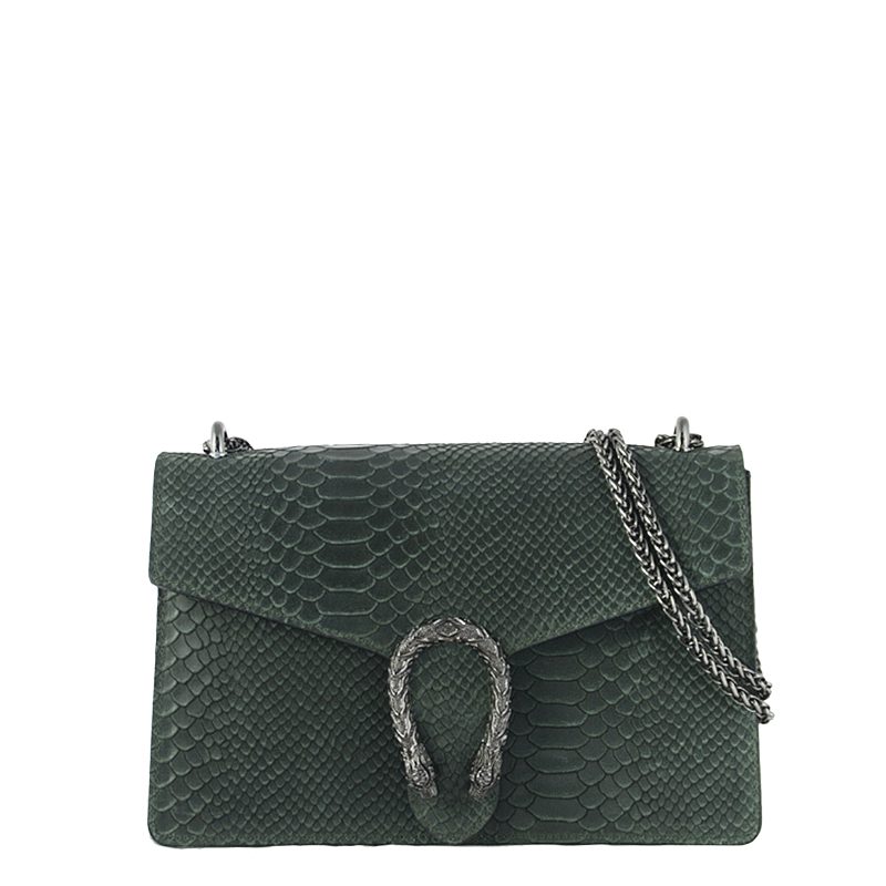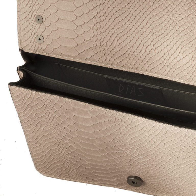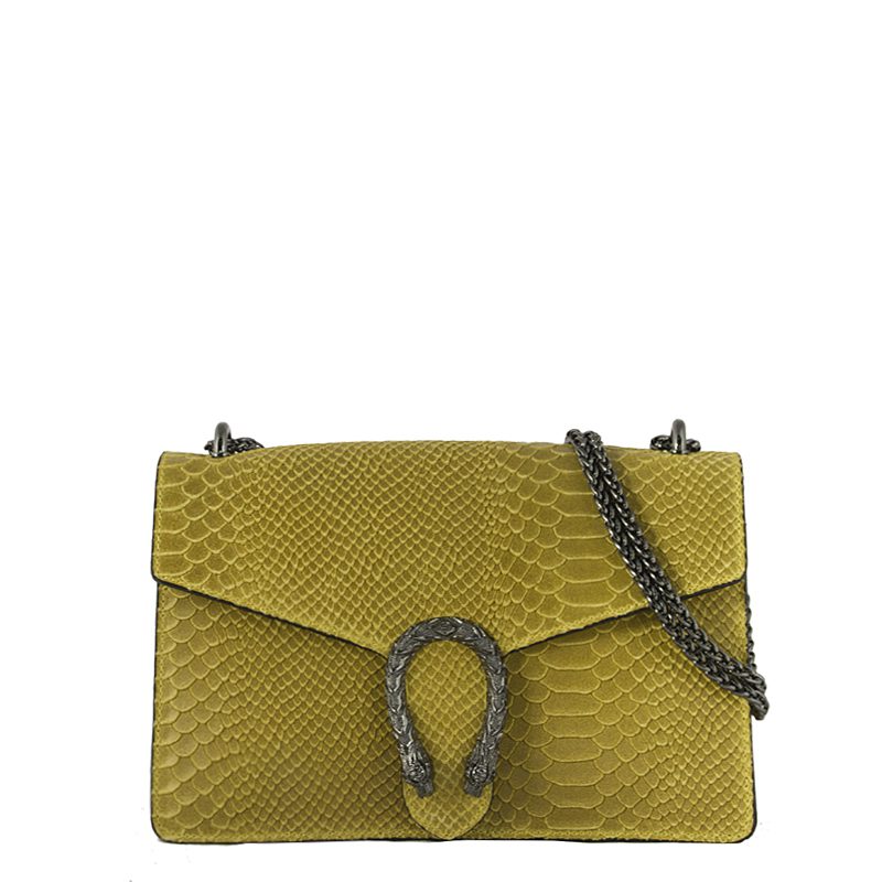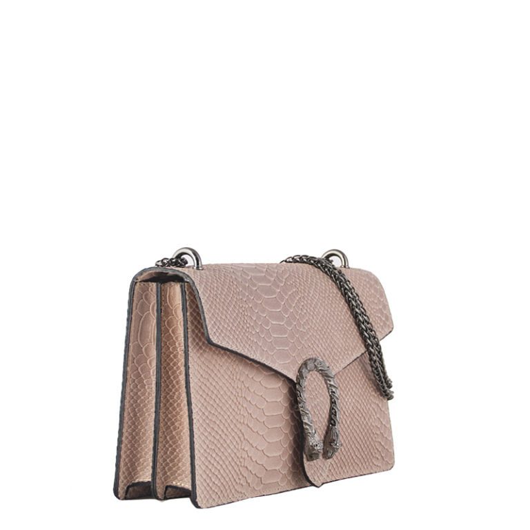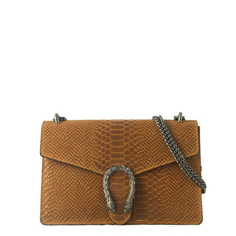The handmade leather tote bag features a snake pattern that adds a unique touch to any outfit. Its design is enhanced by a distinctive tiger’s head closure which gives it an ancient Greek appearance. This tote bag is practical as well equipped with a sliding strap that allows it to be worn comfortably as a shoulder bag. It closes securely with a magnetic clasp ensuring that your belongings stay safe. Additionally the natural bumps on the leather are a charming characteristic of the skin making each bag truly one-of-a-kind and it offers two spacious compartments for organization.