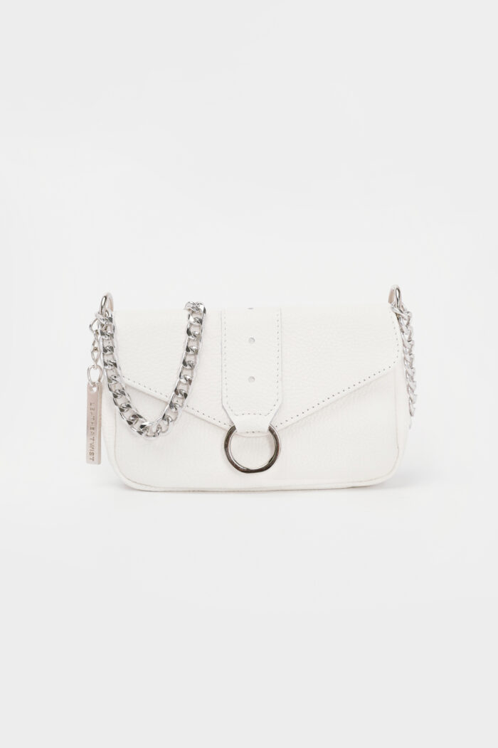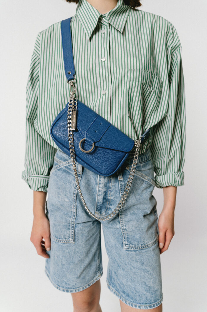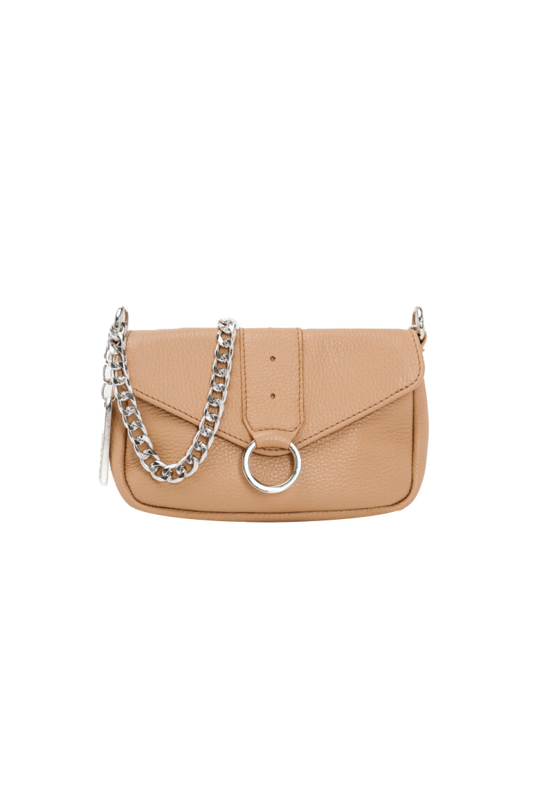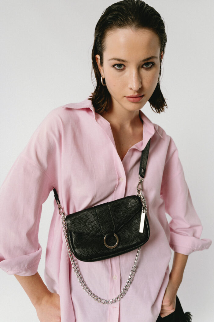 This is a small women’s bag made from 100% cow leather. It opens with a magnet and features a silver decorative hoop on the front flap. It has two straps: a long leather strap that allows you to carry it like a mini crossbody bag and a shiny silver chain that lets you use it as an evening bag. You can take off both straps so you can carry it in the way you like best for any occasion. It carries important items like a cell phone, keys, lipstick and money.