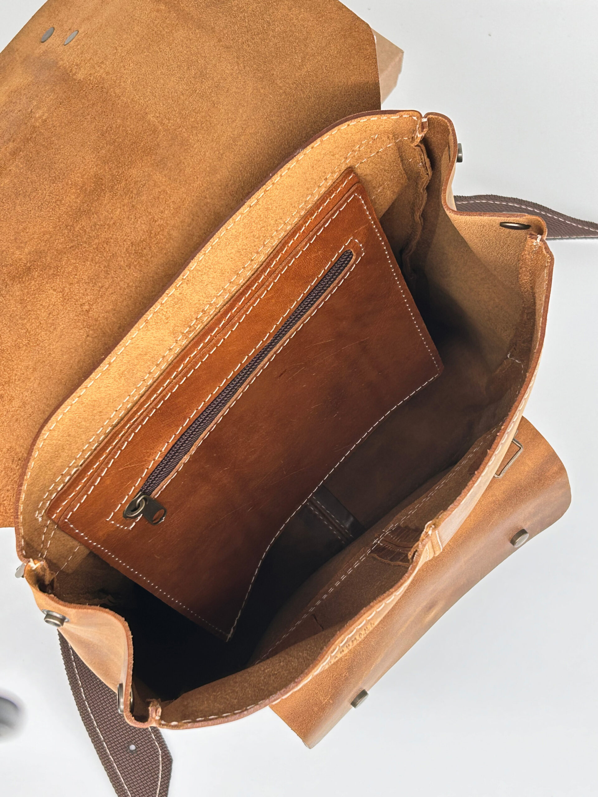 This backpck is a handmade item crafted from high-quality leather. It is designed for everyday use and easily complements various styles. The item features a safety clasp for secure closure ensuring that your belongings stay safe. Additionally the adjustable straps allow for a comfortable fit. Inside there is a zipper case that provides extra storage making it both practical and stylish.