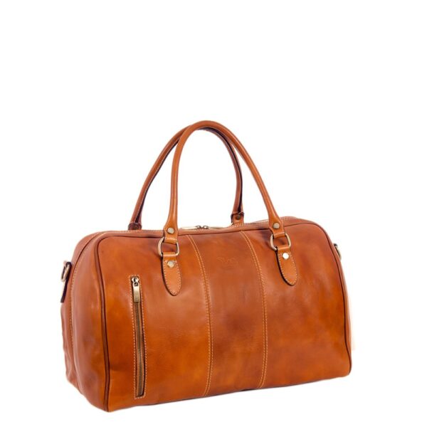 This handmade leather luggage is crafted from genuine vachetta leather known for its durability and beautiful aging process. It features an extra-long leather handle that makes it easy to carry. Inside the luggage has a soft canvas lining and an interior pocket with a zipper providing a safe space for smaller items. The removable strap includes a comfortable shoulder patch making it convenient to carry over your shoulder. Additionally the bronze metal accessories add a touch of elegance to this functional and stylish piece.